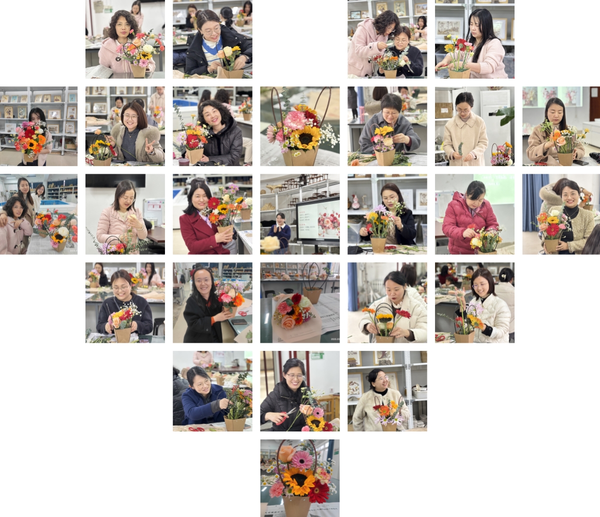 实践环节将活动推向高潮。工会特别准备了向日葵、玫瑰、非洲菊、康乃馨等十余种当季花材,搭配花篮和花泥等材料。女教职工们纷纷化身“花艺师”,或低头修剪枝叶、或举目构思造型,在史倩倩指导下修枝剪叶、构思造型,大家相互讨论、共同切磋,原本普通的花材经过精心雕琢,逐渐蜕变为独具匠心的艺术佳作。