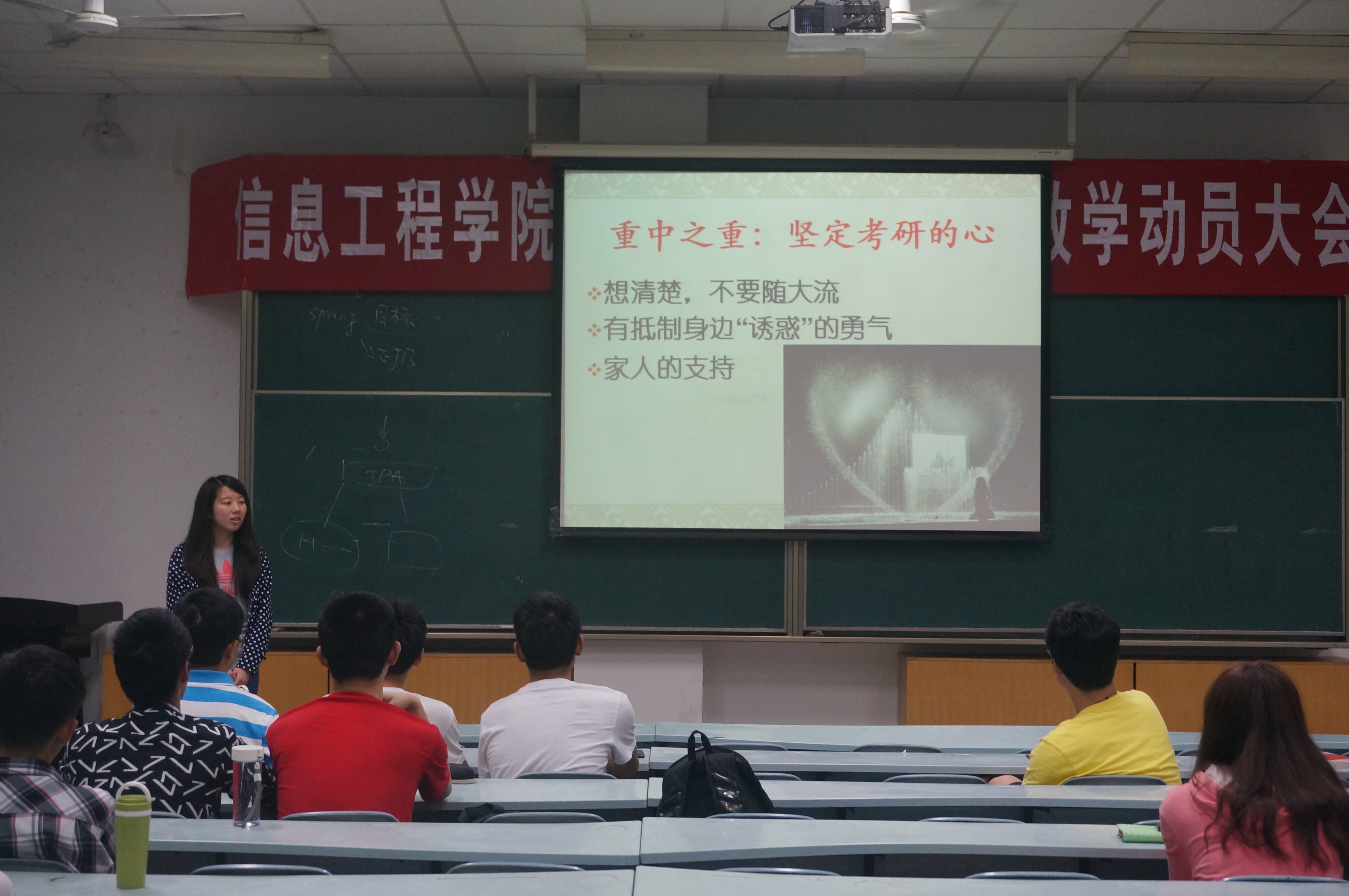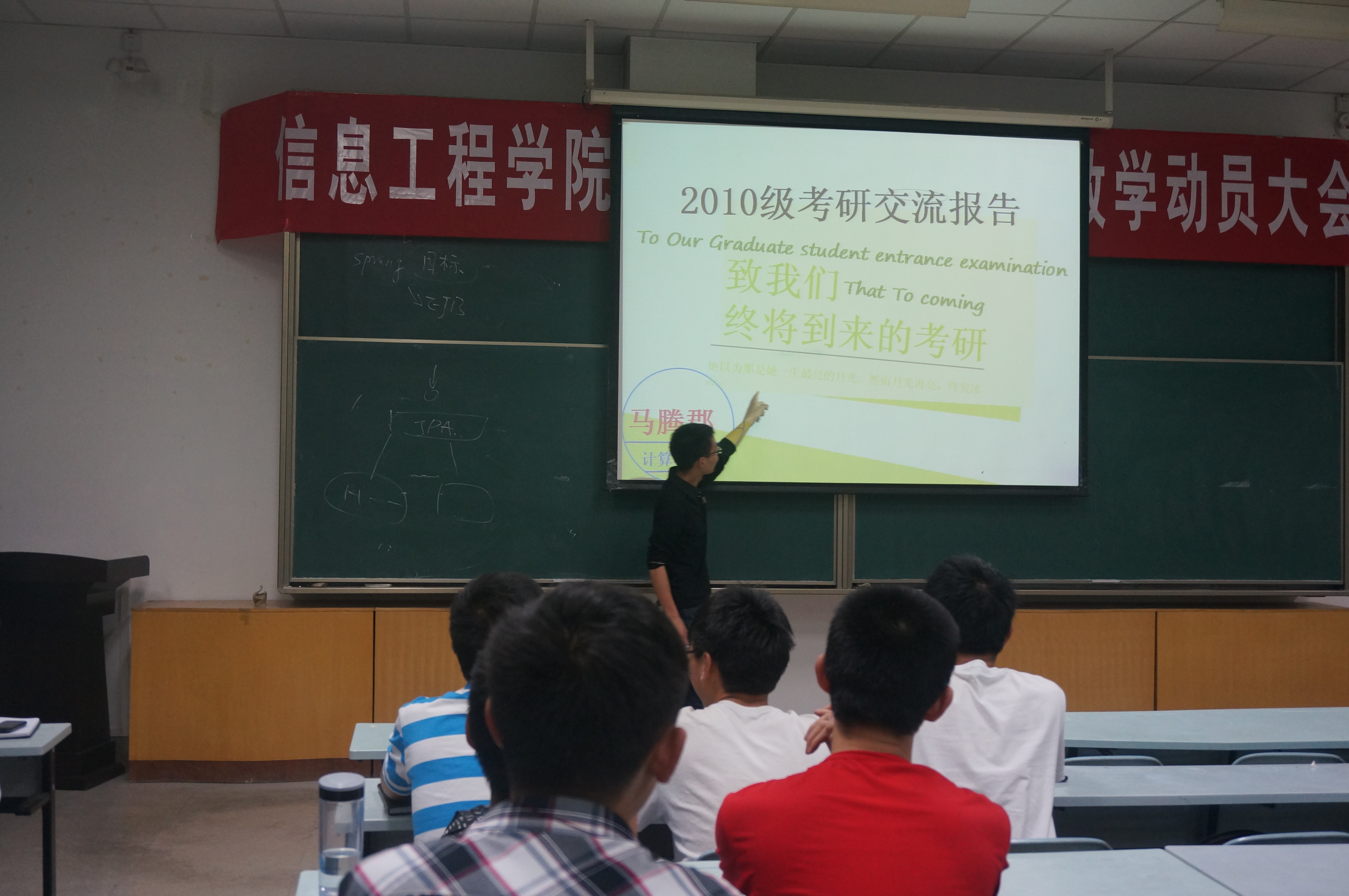 5月16日晚,信息学院在M2教室举行了考研经验交流会。副院长张阳教授主持并加以点评,贾艺凡、马腾郡等五名09级学生进行报告。