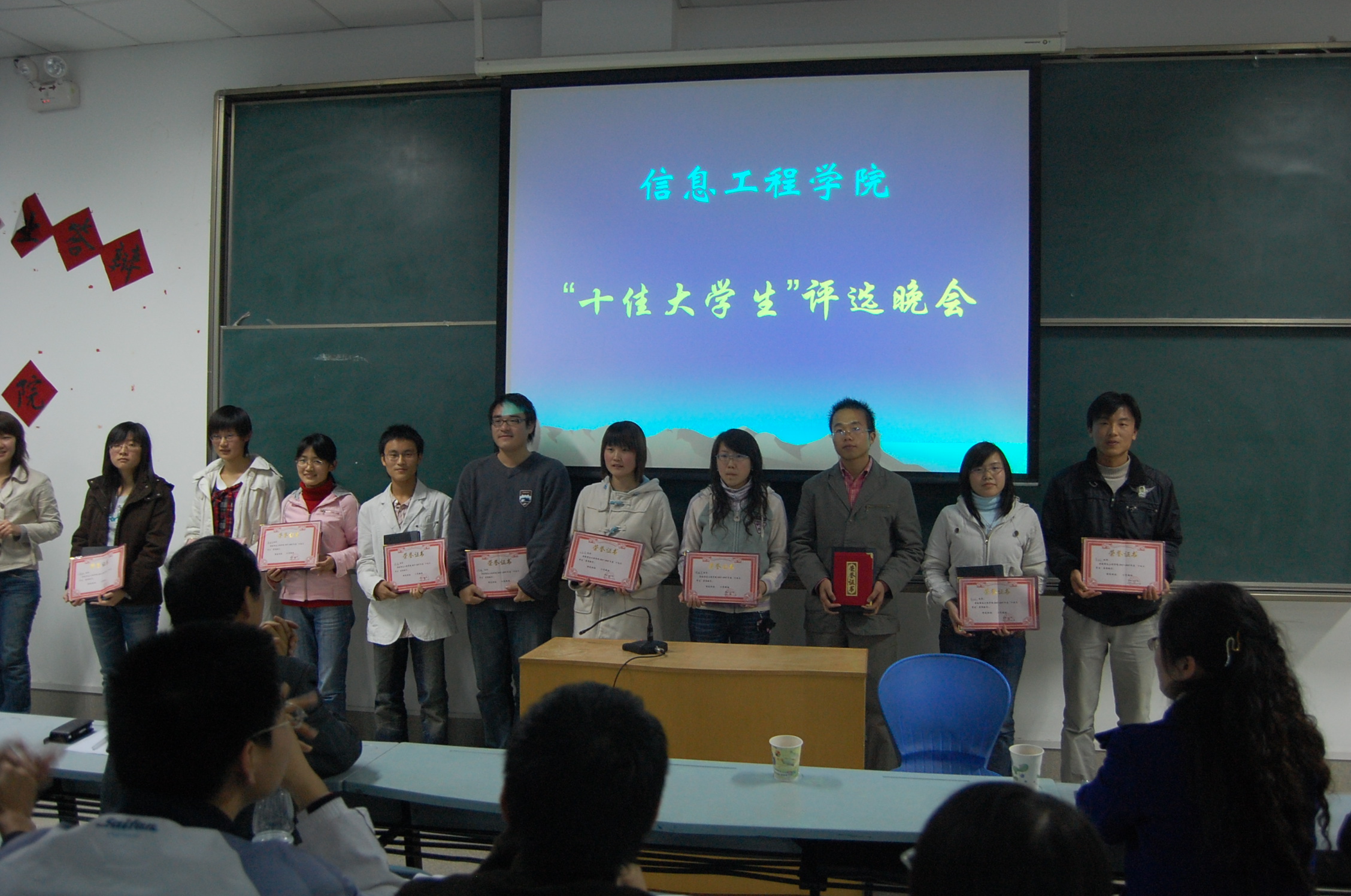 学院党政综合办公室何主任首先致词,他指出:此项活动的目的是以宣传促评比,以评比促学习。并提出两点希望:一是希望团工委、学生会在评选活动后加大宣传力度,进一步营造“比、学、赶、帮、超”的良好氛围;二是十佳大学生候选人应起到模范带头作用,为全院学生做出表率。接下来,15名候选人依次进行演讲和才艺表演。他(她)们分别从学习 、生活 、工作等方面谈了个人感受,精彩的演讲博得了现场同学的阵阵掌声。最后,经过105位同学和5位老师的投票选举,夺得“十佳大学生“荣誉称号的同学分别是:刘睿姝、 张欣 、秦银英 、徐磊 、王梁锋、 王志芳 、周胜男、 孟雨 、郭改 、李钊;获得提名奖的同学分别是:何淳真 、赵庆玲、 马锋 、 陈少华 、周小锋。与会领导和老师为获奖同学颁发了荣誉证书和奖品。