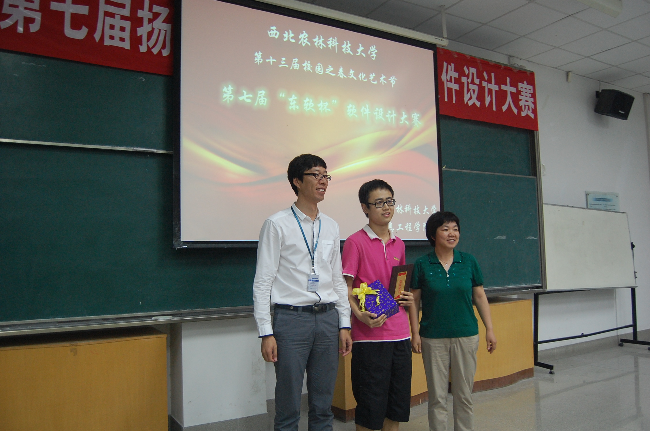 随后进行的作品展示环节是此次比赛的核心部分。入围决赛的作品范围跨度较大,技术水平较高。有既娱乐又动脑的拼图游戏软件、有服务农业的农田杂草图像识别软件、有贴近生活的安卓平台安全卫士软件、有支持旧书营销的管理软件等等。参赛选手联系生活实际,发挥特长,用各种语言编写软件,小巧精致,实用性强,有的甚至已经运用到自己的手机上。大赛中选手们详细介绍了各自的作品,其中软件界面、配乐的匠心独运无不令在座的同学啧啧称奇。参赛队伍的团队合作精神也在作品中充分展现,分工不同的团队成员负责回答评委提问中的某一方面。评委老师针对制作技术、前台平面设计、后台操作等方面给予了精彩点评,赢得了现场同学们的阵阵掌声。大赛共评出一等奖一名,二等奖三名,三等奖四名和优秀奖两名,来自信息学院的尹强同学以其作品《3D俄罗斯方块游戏》获得一等奖,其才华和能力获得了评委的一致称赞。