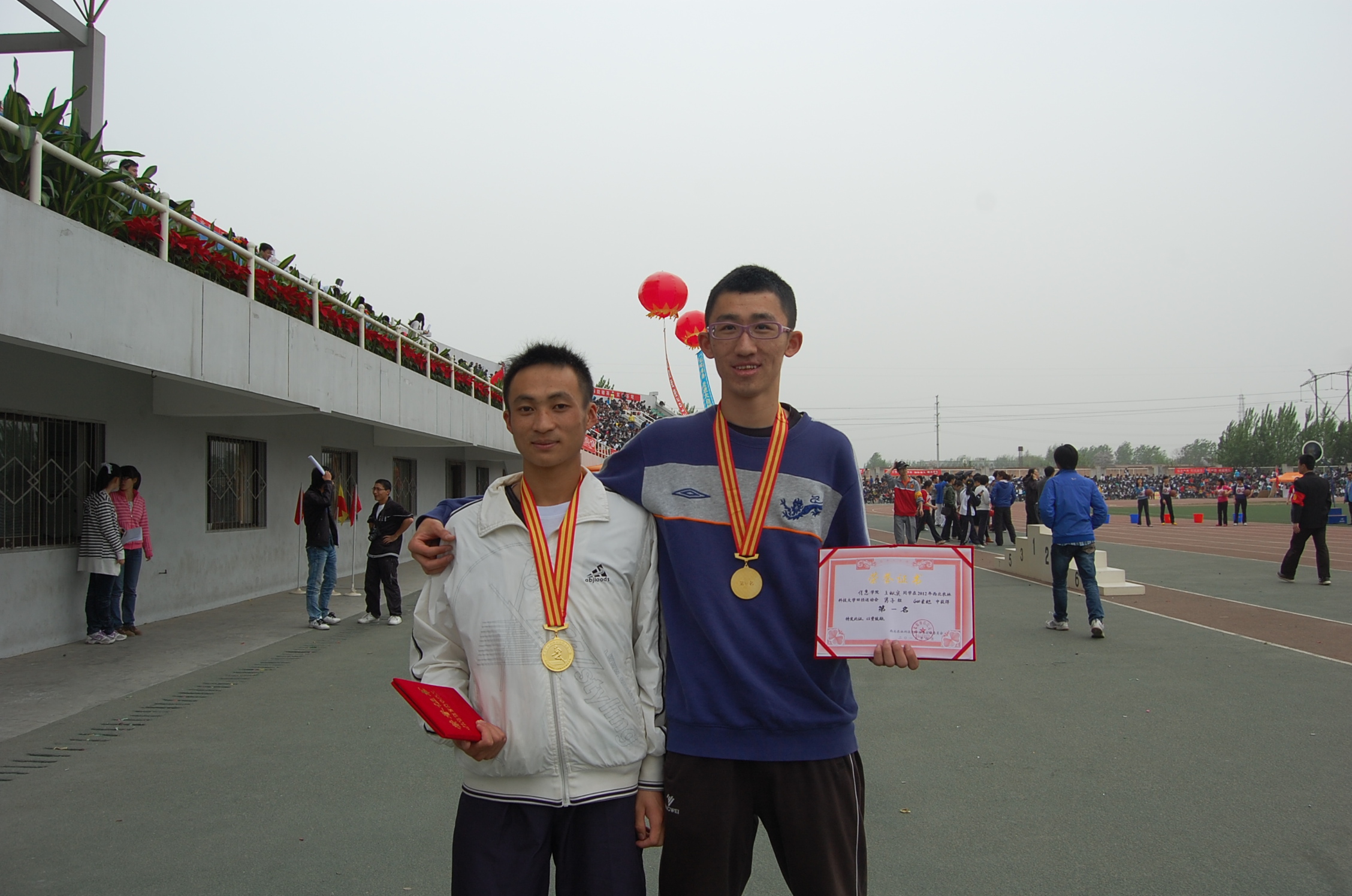 19日上午,永利官网何李军同学在男子800m预赛中,表现出了十足的信心,以预赛第一名的成绩轻松晋级决赛。下午三时左右,何李军同学再次出征,枪声一响,何李军同学如离弦的箭一样奔向终点,两圈过后,何李军同学以明显优势成功问鼎男子800m比赛。赛后校宣传部副部长闫德忠和校党工委副书记赵阿兰为何李军同学颁发金牌和奖状并合影留念。