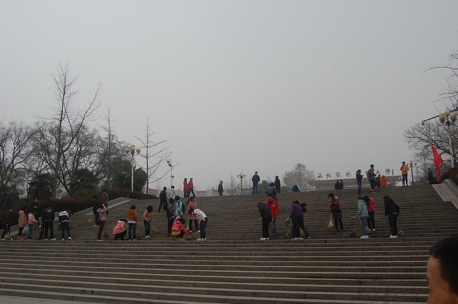 在辅导员桂恺老师的带领下,大家利用课余时间清扫了校门口至山下的全部阶梯。同学们中午即将扫把、簸箕、拖把等工具带到教室,下课后迅速到达指定地点集合,认真严肃地参加了全体动员,积极细心地打扫了每个角落,扫地、拖地、拾捡废旧垃圾。大家干得热火朝天,在寒冷的日子里汗流浃背,心中充满了喜悦。